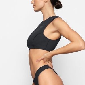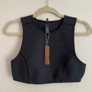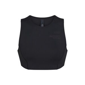 High Scoop Neckline, Velcro On Wearers Left Shoulder For Easy Dressing And Added Sporty Detail, Super Cropped Length, No Lining, Tone On Tone High Gloss Graphic Hits, Sporty Stitching Details • 84% Poly / 16% Spandex