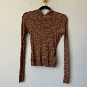 SKIMS sheer stretch-mesh long sleeve hoodie featuring SKIMS’ signature lightweight, breathable fabric with tonal abstract pattern. Designed with a slim fit that contours the body and a flattering V-stitched hood. Good stretch. Perfect for layering. Size Small - 13" pit to pit; 21" length.