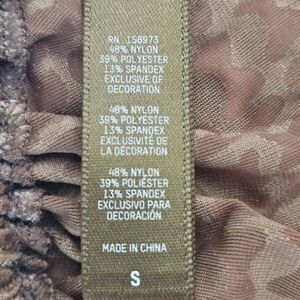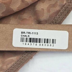Pretty, soft and comfortable.   Triangle cups,  adjustable straps and adjustable back strap.  Logo is flocked all over.  Nylon,  polyester, spandex fabric.   Chai color, size small.