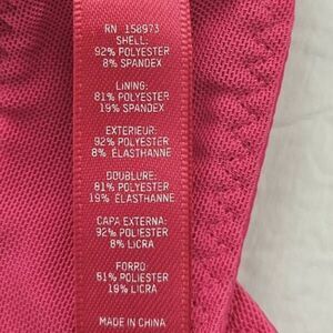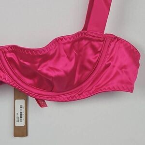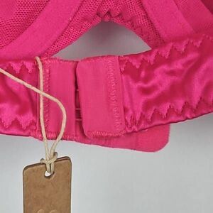 So pretty and comfortable. Shiney satin fabric is polyester spandex with mesh lining. Underwire demi cups for push up, adjustable straps and hook and eye back closure. Raspberry color, size 38C.