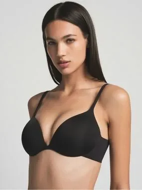 Push-up pad that creates a naturally round and full shape, Lightweight, soft foam for a seamless look under clothing, Plunge neckline, Concealed underwire with a soft brushed casing for comfort, Back elastic straps with adjustability, Hook and eye closure at back