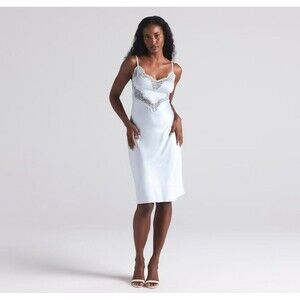 Dress to decompress. Made with our satiny Woven Shine fabric, this triangle neck midi turns up the heat while you wind down or get ready. Adorned with sweet lace trim and a rosette center detail, this dress drapes effortlessly over your body for a luxe, flowy fit. Complete with adjustable straps and fits true to size.