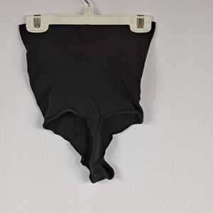 Onxy black, size 2x/3x. Pullon bottom with thong back. Rubber inside waist to hold in place, firm control. Fabric is 78/ nylon, 22/ spandex.