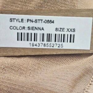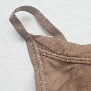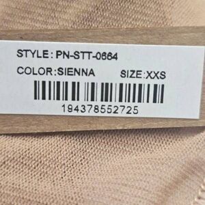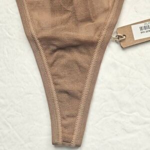 Pretty, soft and comfortable thong. Front panel, sides and back are string with a small back panel. Sienna color, size xxs. Polyamide elastane fabric with cotton lined gusset.