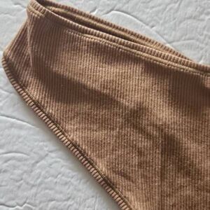Cute, soft and comfortable. Figure flattering V cut panty, thong back. Ribbed fabric. Camel color, size 3x. Fabric is cotton elastane with cotton lined gusset.