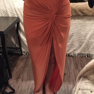 New with tags. This gorgeous coral-colored skirt has a knot-style wrap effect at the top with a full leg slit. Perfect with a crop top, but also cute with a sweater or leather jacket. Size small