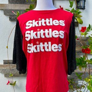 Red Skittles T-SHIRT with Black shimy sleeves - XXXL but runs small. Would fit an XL nicely.