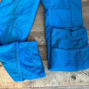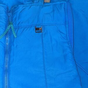 Great used condition pair of SKOR action wear competition series men’s snow bibs. Size XL — has elastic sides down to the hip area—adjustable shoulder straps.— Zipped to the waistline— She is 100% nylon lining is 100% nylon filler is 100% polyester net material is 100% nylon.— measurements are as followed-top of the snow bibs- chest area is 19.5 inches waistband area is 22 inches —inseam to the hemline is 31 inches with an additional 6 inches to keep the snow out. There is a mark on the knee area, which you can see in the pics —ENTIRE CLOSET HAS