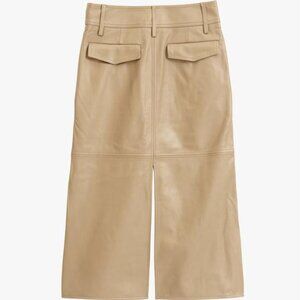 Midi skirt with a high waist made of 100% leather. Belt loops. Front pockets and back flap pockets. Pronounced tonal topstitching detail. Slits at hem. Front zip and button closure.