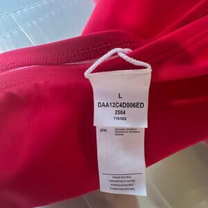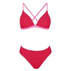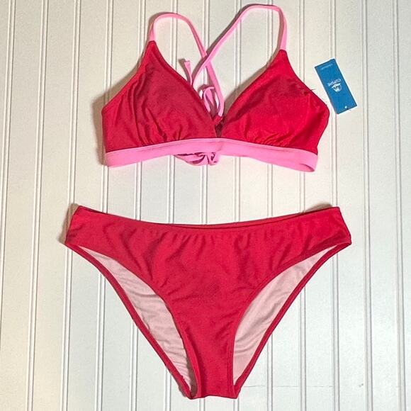 Cupshe two-piece bikini set in size Large featuring a vibrant red triangle-style top with contrast pink banding and adjustable crossback straps with tie detail. Paired with matching red bikini bottoms with soft pink lining. Bold, playful, and perfect for summer. Fully lined stretch swim fabric. New with tags.