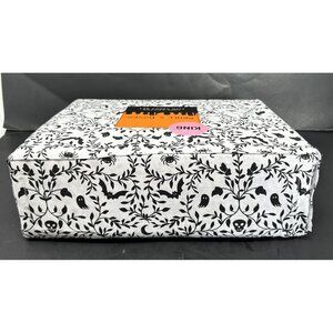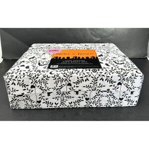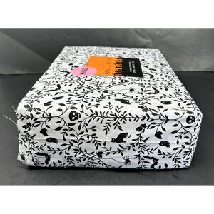 For your consideration is this fabulous, brand new, unused King Sheet Set from Skull & Bones in a spooky botanical pattern. Decorated with black skulls, cats, bats, spiders, ghosts, crescent moons, and vines on a white field, this macabre sheet set comes in its original packaging. It includes one flat sheet, one fitted sheet (to fit mattresses up to 17”), and two king pillow cases. 100% cotton.