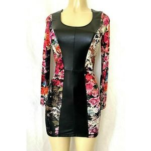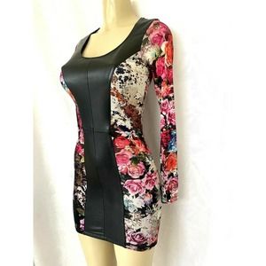 SKY Dress Aviana Mini Floral Leather Long sleeve Scoop Neck Lined Cut Ou…