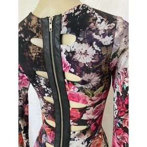 This body hugging mini in floral is perfect for a night out, with its genuine leather panels and back cut-outs