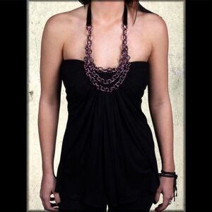 Sky Alysson Women's halter top is embellished with a tiered chain necklace that is encrusted with pink jewel gemstone that drape across the front and features a scoop back that ties around the neck. Shirred fabric creates a very flattering look. Fabric is soft and stretchy. Looks perfect with jeans, pants, or a skirt.