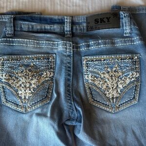 SKY Light Wash Women's Bootcut/Flare Jeans size 3/4, Rhinestone Rivet Accents