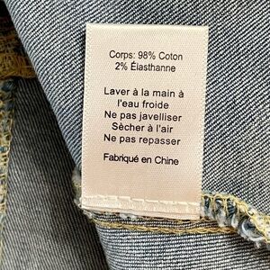 SKYLAR MADISON, MEDIUM WASH, STRETCHY DENIM, FRAYED BOTTOM SUMMER TOP. ANTIQUE GOLDTONE BUTTON FRONT CLOSURE. SIZE M