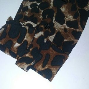 I only have two available, one large and one small. Brand new/never tried on, the color is a traditional leopard print, the gold tone zippers are still in the protective plastic, the sleeves can either be worn down or rolled up, there is a leather style border as shown around and behind the neck, V-Neck.
