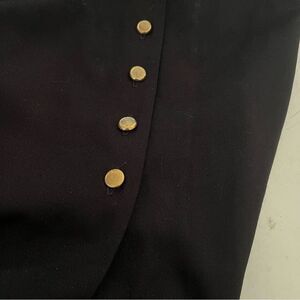Vintage Dress in Black with gold trim and decorative studs. Attached shoulder pads. No lining. Self tie sash across back creates a feminine silhouette and better fit. Please note, the button at the very bottom has been replaced and is not identical to the rest. There are no other apparent flaws. Since this is vintage, and likely from the 70s or 80s, it’s a good idea to pay attention to measurements.