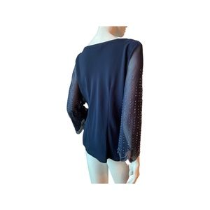 Beautiful blouse…a perfect holidays top to wear …..in navy tone fabric….embellished sleeves with tiny pearls….art deco inspired design by S.L Fashions…pull on….pre-loved in great conditions.