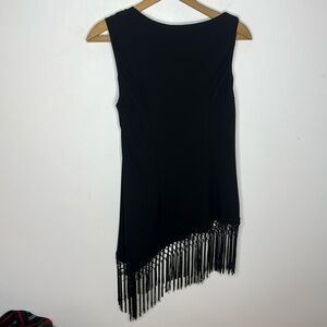 Turn heads in this chic S.L. Fashions black sleeveless dress! Crafted from a comfortable and flattering polyester fabric, this dress features a modern asymmetrical hemline adorned with playful fringe detailing that adds movement and flair. Perfect for a variety of occasions.