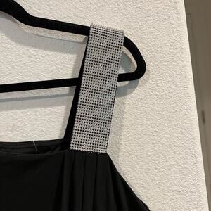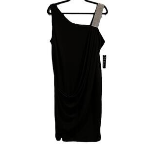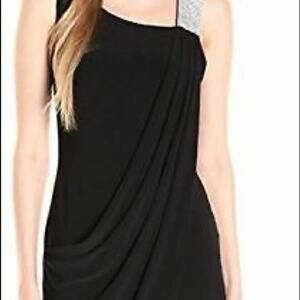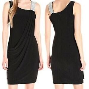 S.L. Fashions Mini Dress Missy Youth 16 Black Rhinestone Strap Draped Stretch Jersey Back Zip Ruched Party Event Holiday Glam LBD Little Black Dress Revenge Dress Homecoming Date Night NEW