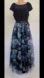SL Fashions gown with a flowing, floral-print organza skirt and a satin sash belt at the waist.