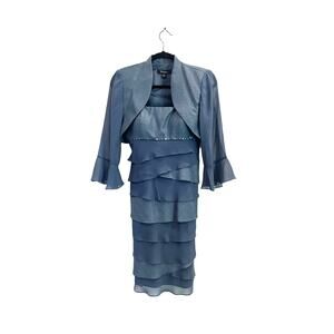 SL Fashions Formal DRESS 2 + Cropped JACKET 6P Blue Tiered Beaded Sequin Ruffled Sheath - New Condition without Price Tags!