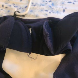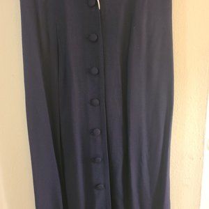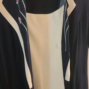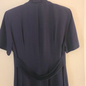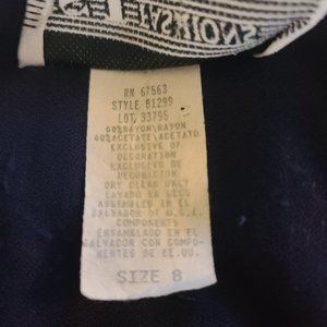This is a SL Fashions Ladies Dress. In very good condition. Navy Blue with pink flowers on the lapel, the "white Cami/scarf" on the front is sewn on the dress on one side and attaches to the inside of the dress with buttons opposite side. Backside has several decorative loops (they are sewn into the dress) and shoulder pads sewn into the top of the sleeves. It buttons up the front. The buttons are fabric covered. All the buttons ae the original. There are pleats on the front and back of the dress. See the pictures, zoom in on them. It is midi length and hangs very well. The fabric is rayon/acetate (see picture of the tag). There are no rips or tears or fading. The dress has never been altered. Everything on the dress is original. It does have to be dry cleaned and has been very well taken care of. It has been in my closet covered to keep the dust off of it.