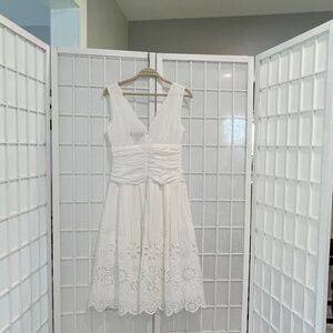 Beautiful flowy white dress with ruched waist & hemline scalloped eyelet detail. Flattering V-neck front and back. Dress is lined.