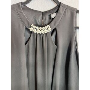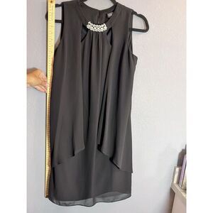 Women’s black SLNY dress Size 6 Pearl beading at high neck with w cut outs Sleeveless flowy knee length dress with Chiffon overlays in front and back Super flattering