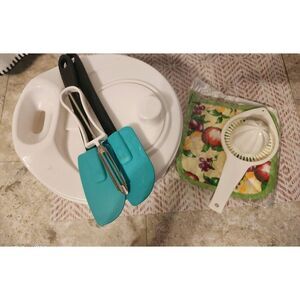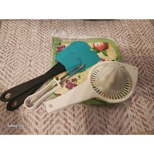 ▪︎DESCRIPTION: White salad spinner, new. Two turquois spatulas, white peeler, citrus juicer, and 2 hot pads.