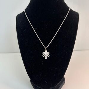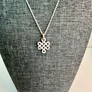 Rare, never worn, sparkly SLANE sterling and pave diamond eternity knot necklace. Removable sterling silver chain adjusts between 18" and 16." Recently cleaned and inspected by original jeweler-Bailey's Fine Jewelry. Bailey's box and velvet protective pouch included. All other props were used for staging/photo purposes only and are not included. Back of pendant is pictured in the next to last photo. Coordinating ring, last photo, is not included but sold separately.