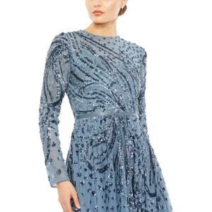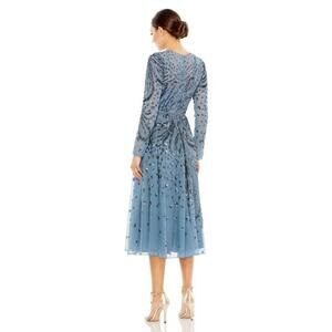 Mac Duggal 5572 slate blue tea-length formal dress features an A-line silhouette with a jewel neckline, semi-sheer long sleeves and a zipped-up back. Intricate sequin beadwork encrusts this midi evening dress, finished with a beaded waistband and a gorgeously flared skirt.