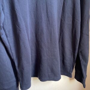 Washable cotton polyester blend for a soft stretch feel, navy blue with vertical rib detail, crew neck. Excellent condition. Size XL, measures 22” from armpit to armpit and 28” from top of shoulder to bottom hem.