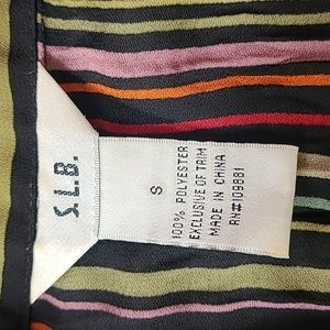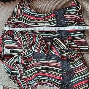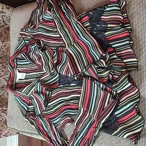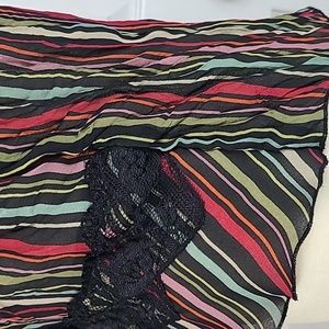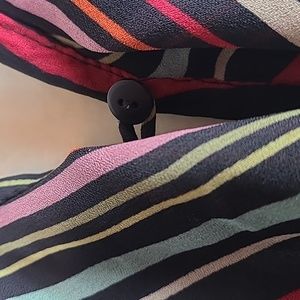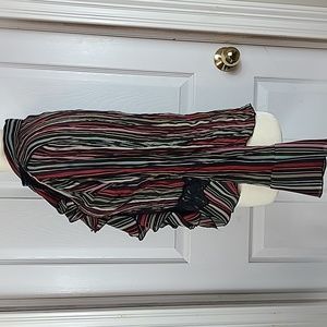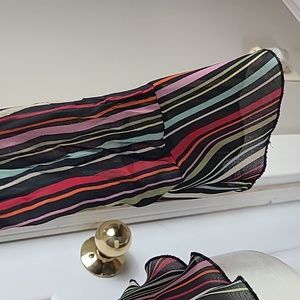 Long Bell Sleeves, Button Down, W/ Buttons and Loops, Ruffle Front Blouse, Krinkle Fabric, Trimmed in Black Lace, Stripe Print, in Black , Red, Blue, Green, and Orange, Size Small.