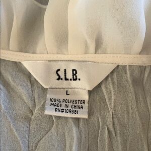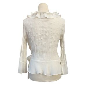 S.L.B. white ruffle notched collar blouse; hidden inner button closure at side waist, hidden button at chest, and sheer tie at side.the tie is slightly frayed as pictured. Sheer crinkle fabric bodice; 100% polyester.