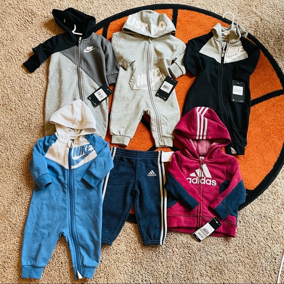 All size 6 months NWT except baby blue Nike coverall EUC .. adidas has a white spot on pants as seen in photos bought that way!
