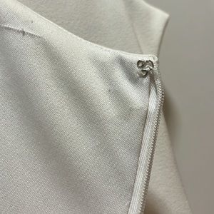 White, coral and tan block striped dress, Form fitting made with polyester and spandex. Front seam could use some repair, no holes and great for the office with a blazer!