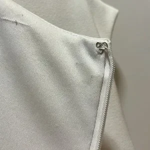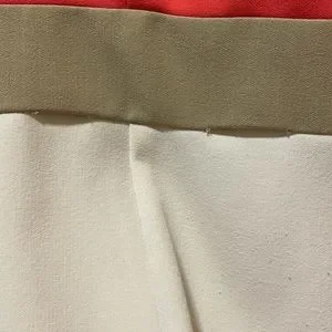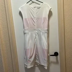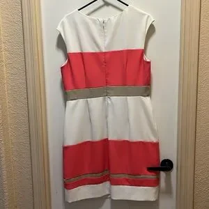 Spring White, Coral and Tan striped dress. Form fitting, made with polyester and spandex. Front seam could use some repair, no holes and great for the office with a blazer!