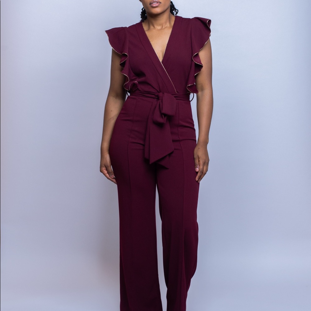 - Overlap Ruffle Detail Wide Tie-Side Jumpsuit