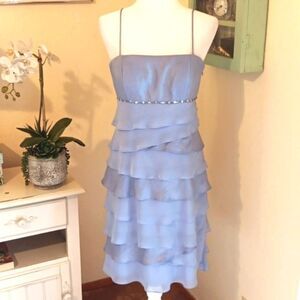Lovely light purple piece by S.L. Fashions. Two pieces, a dress and a bolero jacket. The dress has tiered ruffles of alternating sheer and dupioni-like fabric, shimmery. Spaghetti straps, built in bra. Size 8 measures 38 at chest. 30 under chest, sparkly embellished trim here. 38 at hips. 37.5 long from shoulder to hem. The jacket fits comfortably over. Ideal for a gorgeous mother of the bride.