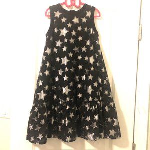 SLICE Beautiful sparkly silver stars pattern, black background flare dress sleeveless with bottom ruffle. Comfortable, lightweight, great for a holiday party or play date. Round neckline with back zipper closure and black lining. Made in Canada Very good condition, worn once. 31 inch long Size 11/12