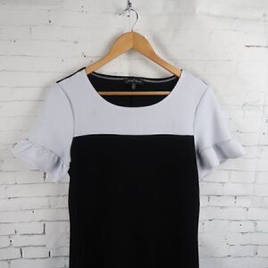 BLACK & WHITE COLORBLOCK RUFFLE SLEEVE ROUND NECK MIDI SHIFT DRESS SIZE S BY SLINKY BRAND PRE OWNED NO FLAWS