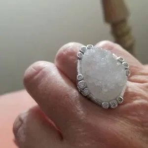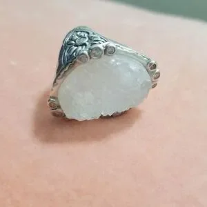 Lovely Sterling silver, with 12 little cz's and Drusey, one cz on each side in middle of flower outline, very pretty. 1 1/4" tall and 1" width face of ring.