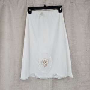 Beautiful slip skirt with lace hem, front hem has 2 scallops, lace applique on front with brown hued embroidered flower. crease that won't come out shown in last photo looks to be a manufacturer error rather than a pull but not sure.