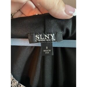 SLNY Black Metallic Silver Floral Lace Fringe FLAPPER MIDI Dress Sz 8