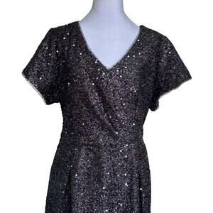 SLNY Black Sequin V Neck Short Sleeve Knee Length Cocktail Event Dress Sz 18 W Wedding Guest Special Occasion Going Out New Year’s Eve