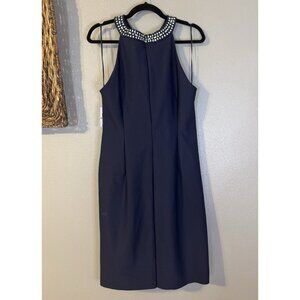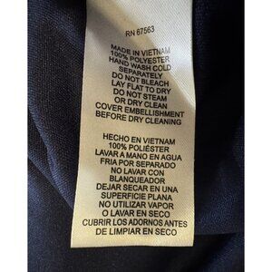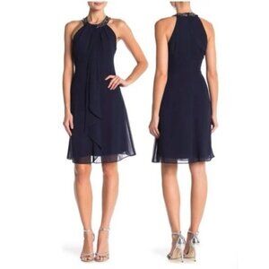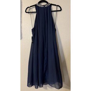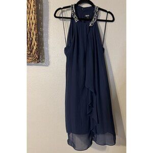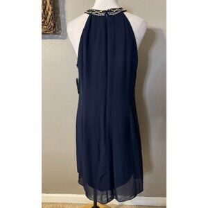 This pretty dress is from SLNY in a misses size 14. Dark navy blue in color. Has crystals around the neckline. Soft and stretchy, made of polyester chiffon. Hand washable. Has a back zipper.