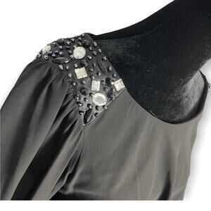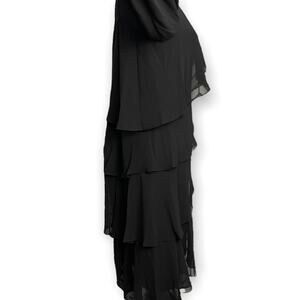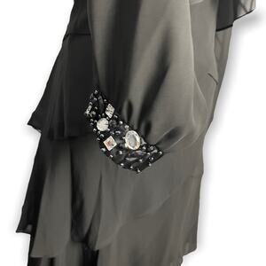 Gorgeous black ruffle layered dress. Sleeves are sheer. This dress also has gem and beading accents on shoulder and end of sleeves. Brand new with tags!