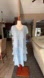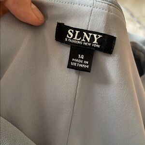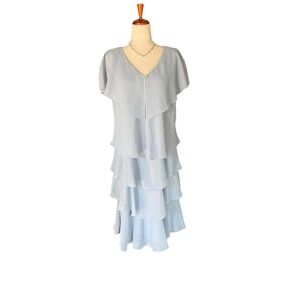 Measures 23 inches pit to pit an 43 inches shoulder to hem. Elegant Sophistication: Elevate your style with this S.L. Fashions chiffon dress, featuring a scoop neckline, and flattering tiered ruffles – perfect for weddings or formal events.